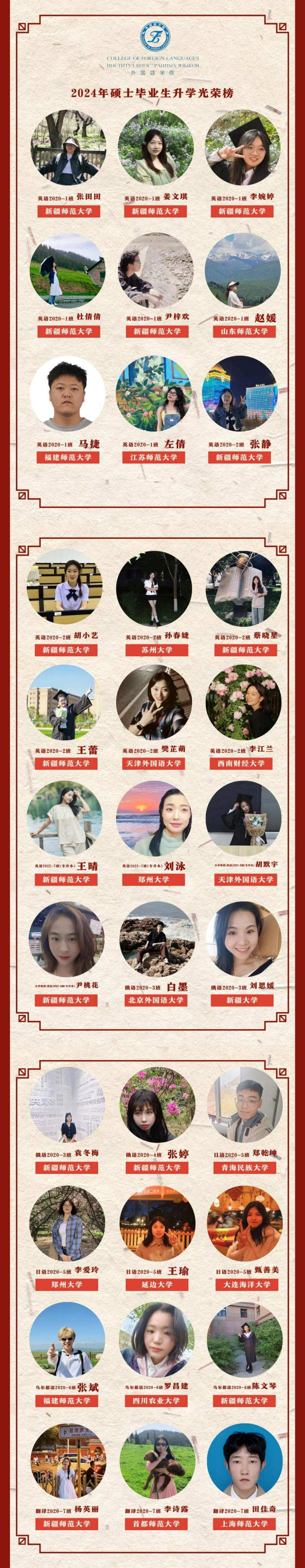 又是一年收获季,点滴汗水浇灌成功之果。星光不问赶路人,时光不负有心人。我院2024届本科毕业生中有32名学生成功考取硕士研究生,分别被北京外国语大学、首都师范大学、上海师范大学、郑州大学、青海民族大学、大连海洋大学、延边大学、四川农业大学、福建师范大学、山东师范大学、江苏师范大学、天津外国语大学、西南财经大学、苏州大学、新疆大学、太阳集团tyc33455、新疆农业大学等高校录取。让我们向金榜题名的同学们表示热烈的祝贺!他们是我们学习的榜样!