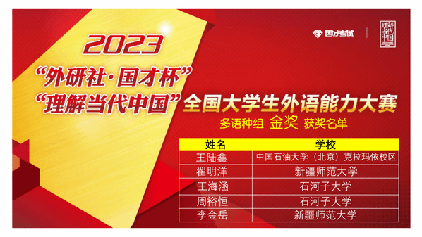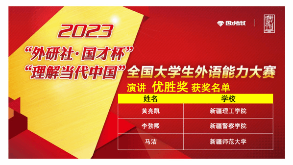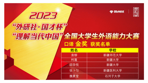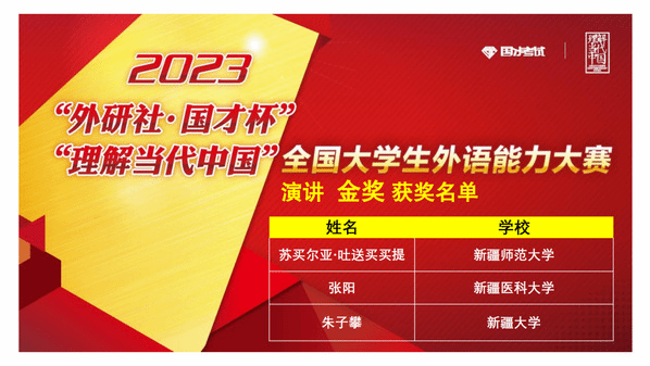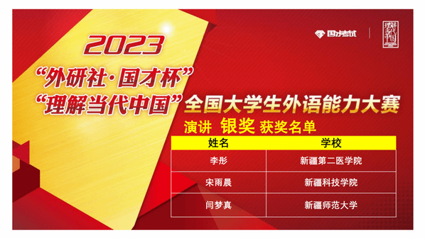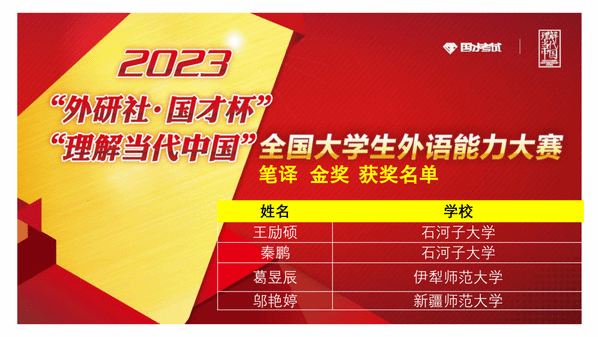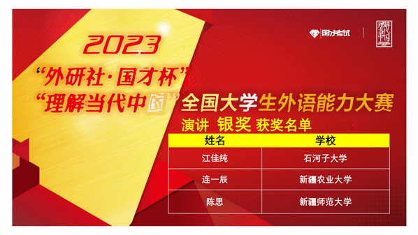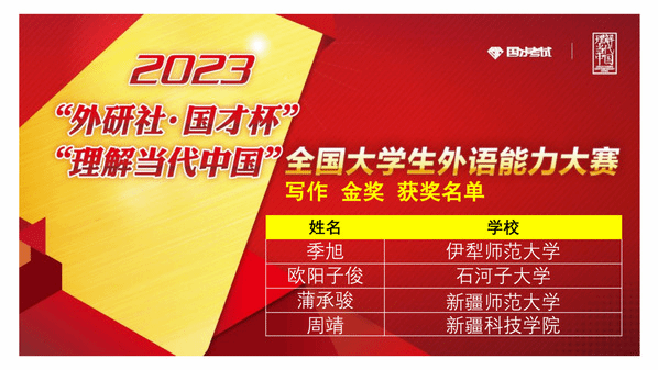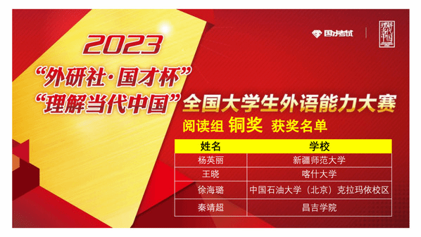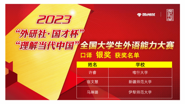 由新疆维吾尔自治区教育厅主办,新疆高校外语教学研究会、外语教学与研究出版社协办,喀什大学承办的2023年“外研社·国才杯”“理解当代中国”全国大学生外语能力大赛新疆赛区复赛于2023年11月4日(星期六)成功举办。本次复赛共有全疆29所高校,231名选手参加。经过激烈角逐,我校学生在演讲、写作、阅读、口译、笔译、多语种组比赛中均获得优异成绩。太阳成集团tyc33455ccwww张黎老师、甄珍老师指导的学生苏买尔亚·吐送买买提、阿伊米萨·白合提亚尔荣获演讲组金奖,陈川老师指导的学生袁柳荣获口译组金奖,熊杰老师、李英军老师指导的学生邬艳婷、徐诗雨荣获笔译组金奖,何江老师指导的学生蒲承骏荣获写作组金奖,伊力米热·伊力亚斯老师、燕姣老师指导的学生翟明阳、李金岳分别荣获俄语组、日语组金奖。刘蓉老师、李娜老师指导的学生闫梦真、陈思荣获演讲组银奖,尹小荣老师指导的学生郝康利荣获写作组银奖,邹彬老师指导的学生宿文慧荣获口译组银奖,赛丽塔娜·艾合麦提老师指导的学生张欣雨荣获阅读组银奖。符冬梅老师、胡燕花老师指导的学生杨英丽、朱思奇荣获阅读组铜奖。郑琴老师指导的学生马洁荣获演讲组优胜奖。本次比赛获得金奖的学生将代表我校参加在北京举办的全国总决赛。