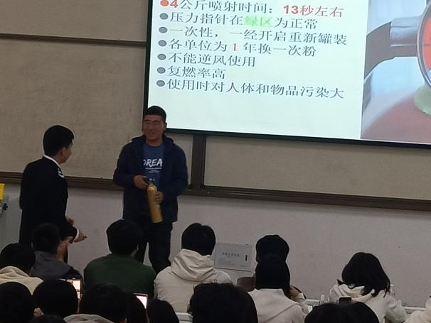 活动伊始,王炫煜老师以“人人讲安全,个个会应急”为题,聚焦校园消防安全大类,围绕逐级消防安全责任制度、火灾隐患的类型、火场安全逃生技能灭火器材使用等多个方面进行详细介绍结合近年来乌鲁木齐市发生的部分火灾典型案例进行讲解,同时,对消防器材日常管理、平时检查、消防火灾的应急和预防、消防器材的使用方法进行了深入浅出的讲解传授了防范措施和火场自救逃生方法王炫煜老师现场邀请王平平老师演示灭火器的使用方法,邀请学生演示防烟面罩的使用方法,并做了正确的示范。