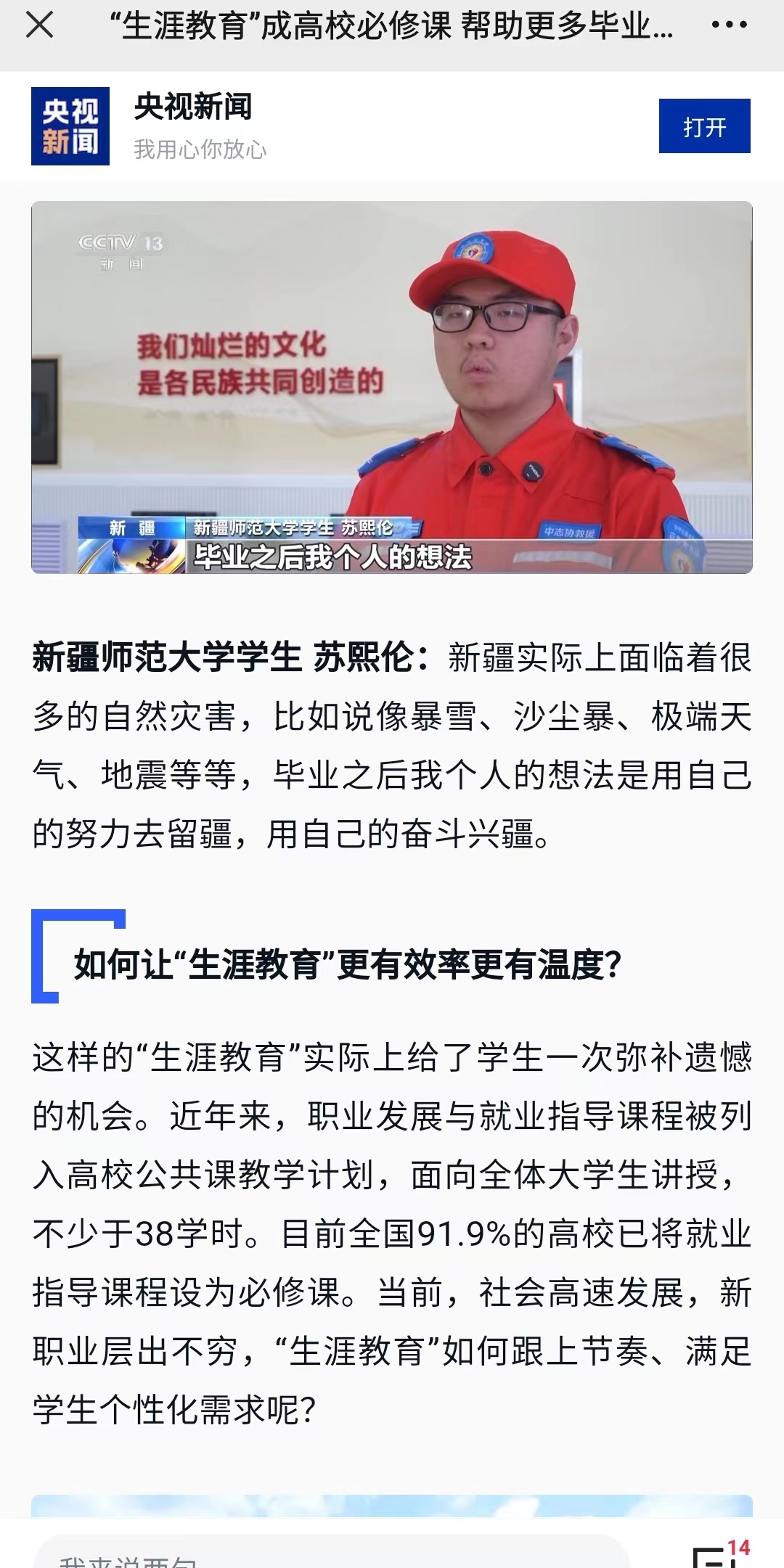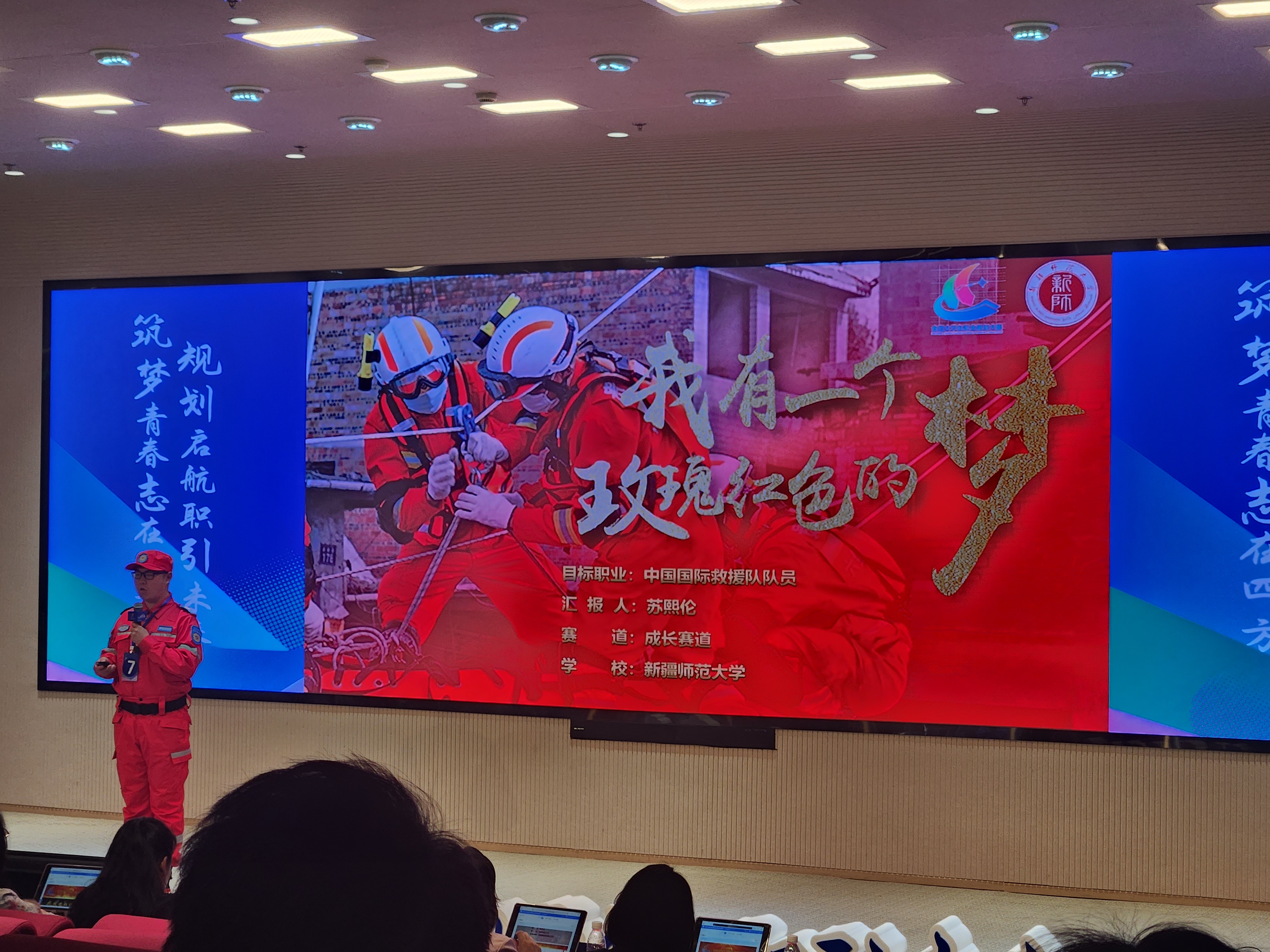 苏熙伦以“国际救援队联络官”为职业目标,以“我有一个玫瑰红色的梦”为题,聚焦翻译专业助力、救援能力保障、志愿服务大美新疆等内容,从梦想播种、发芽、开花、结果四个阶段呈现了自己成为救援队员的成长与行动。比赛前后,苏熙伦分别接受中央广播电视总台新闻频道、新疆记者站及多家媒体采访,央视新闻客户端刊发了相关报道。