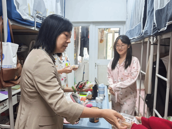 董馥伊书记亲切问候节日留宿24级新生,询问他们假期安排、生活难题、学业困惑,与学生深入交流,一起品尝学院定制的学校专属月饼,引导同学们传承中国传统文化、孝敬父母,学会做人、学会做事、学会学习,享受在校的学习时光,合理安排假期空闲时间,及早规划大学学习生活,学好外语专业,践行“用外语讲好中国故事、新疆故事”的专业使命,成为扎根边疆的小胡杨。