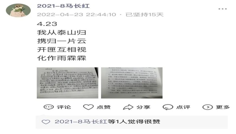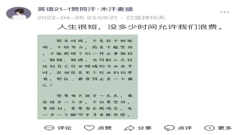 “粗缯大布裹生涯,腹有诗书气自华”,希望学生们通过15天的打卡活动能够养成阅读习惯,在不打卡的今后,延续打卡阅读的状态,通过阅读充实自我、成长自己,在大学中充分利用学校图书馆、学院图书室,多读书、读好书,将自己锻造成为优秀的大学生,为将来走入社会积累能力与经验。