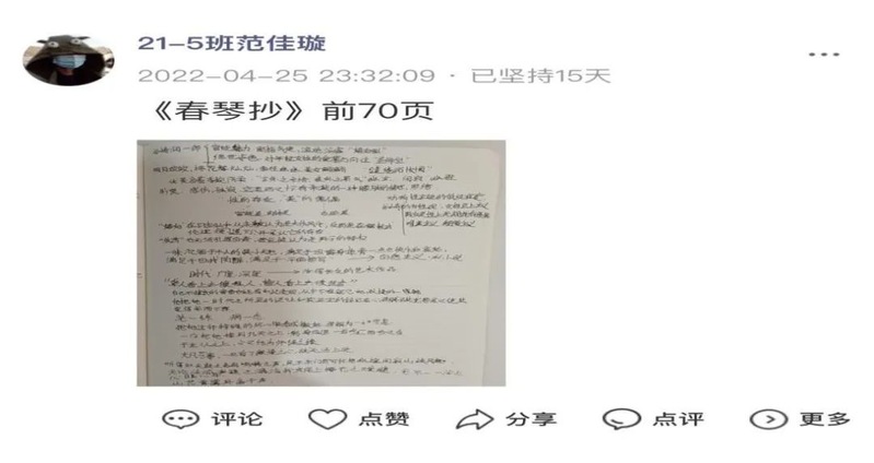 15天的阅读打卡任务改变了我晚上的生活与习惯。原先基本都是躺下刷手机,现在则是打开台灯、翻开书,读上一两小时。从中,自己的内心也得到了沉淀,似乎又回到了作者的时代,和作者一起感受文学之美和历史之美。