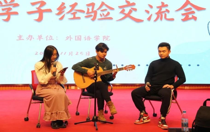之后,三位同学与我院2021级研究生考赛尔·沙地克江(英语学科教学)、胡小晖(俄语笔译)接受访谈和提问,围绕英语学习方法、学业规划、升学考研等内容与现场观众深入交流,并为现场观众解答有关英语学习方法、学业规划、就业考研等问题。访谈结束后,考赛尔、胡小晖、杜文灿三位同学现场弹唱歌曲串烧,将交流分享活动推上高潮。