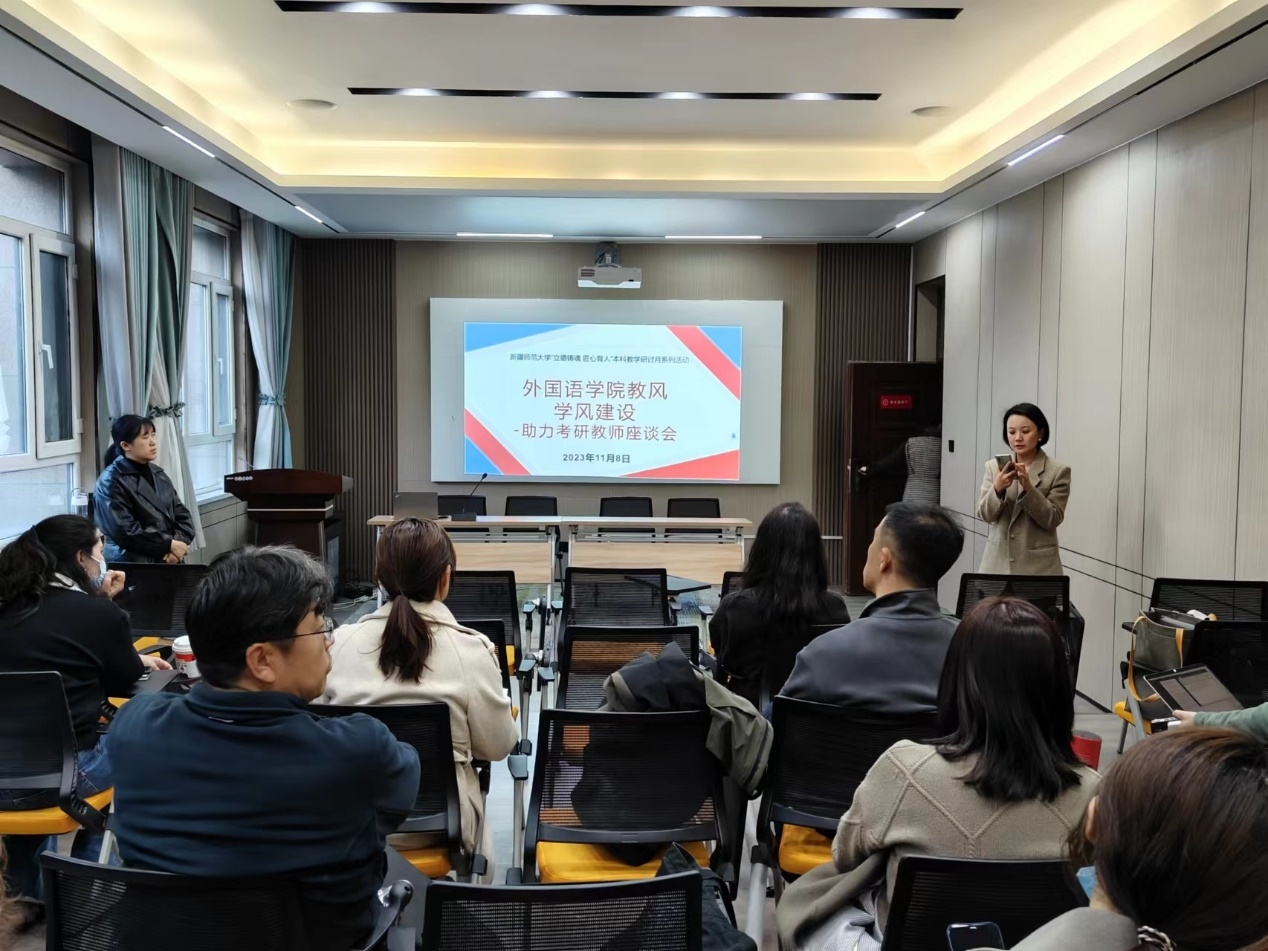 座谈会伊始,杨新璐副院长介绍了太阳成集团tyc33455ccwww2024届毕业生的总体研究生考试报考情况及存在的问题,并强调了学业班主任和学业导师助力考研的重要性。随后,2021级学业班主任分别介绍了对英语、俄语、日语、翻译及乌尔都语专业各班学生考研意向的摸底情况,并提出目前学生对备考存在的一些困难和疑问。最后,2021级学业班主任及学业导师围绕如何发挥学业班主任和专业核心课教师的作用助力考研展开讨论。老师们表示要以有意愿报考研究生的学生为抓手,帮助学生制订详细的阶段性考研复习计划,以备考学校和备考专业的选择、备考过程中专业课准备的答疑解惑以及复试准备过程中的指导为切入点,切实在考研的全过程中发挥学业班主任和学业导师的指导作用。