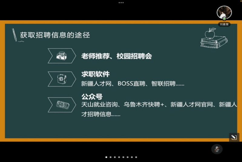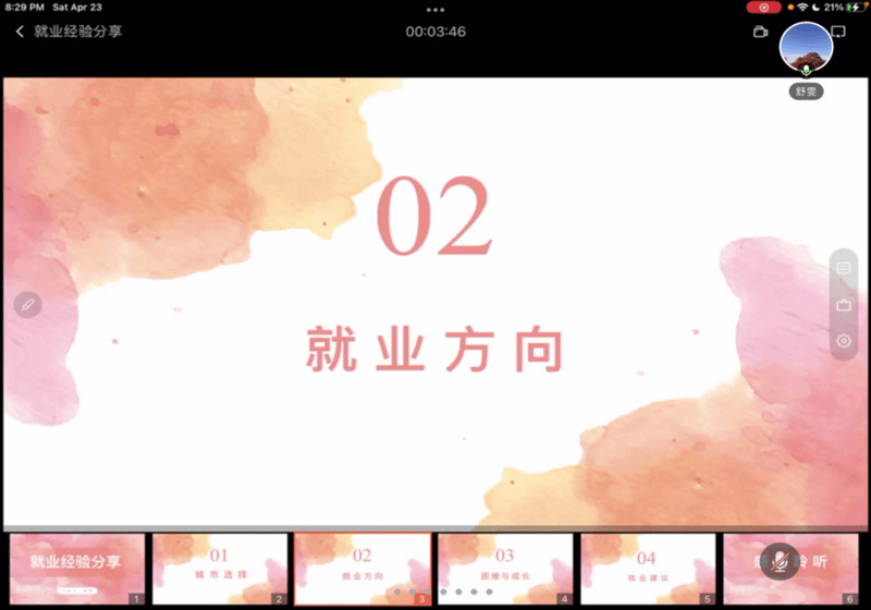 2019届英语专业毕业生夏特克·多斯肯介绍了选调生的报考要求、考试形式、备考经验,并分享作为社区工作者的工作内容与体悟,鼓励毕业生深入基层一线就业、磨炼意志品质,在服务国家发展战略中成就自我;2019届英语专业毕业生黄梦雨结合自身经验讲述备考教师岗位的心路历程,动员毕业生把握校内招聘机会、获得就业先机;2020届英语专业毕业生舒雯、2020届俄语专业毕业生刘嘉慧、2021届日语专业毕业生张楠分别从私企、国企、外企就业经历讲述求职经验与应聘技巧,引导毕业生提前做好求职规划,充分利用各类招聘活动、积极开拓就业渠道、增强求职信心。2020届英语专业毕业生吴佳琪从应征入伍流程、服兵役优惠政策、军旅生活等方面详细介绍了自身参军入伍的历程和成长收获,倡导毕业生追求先进、积极响应国家号召。