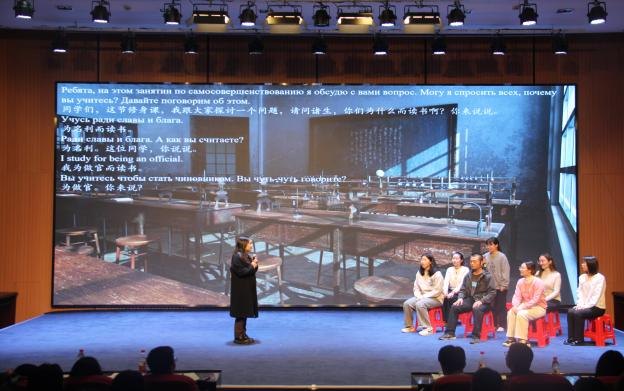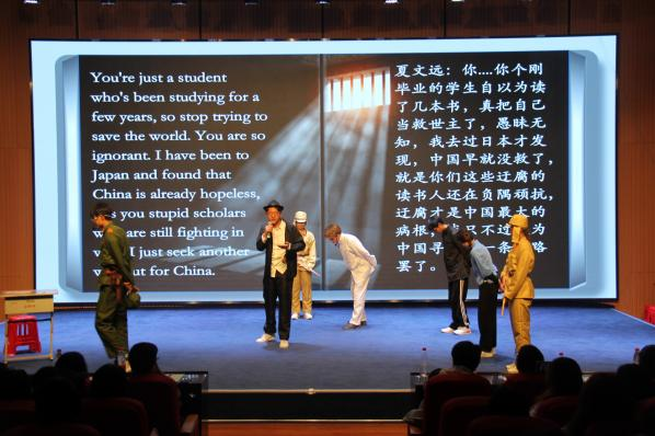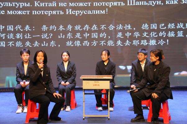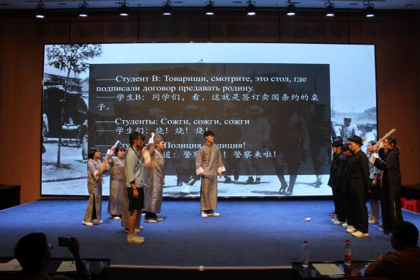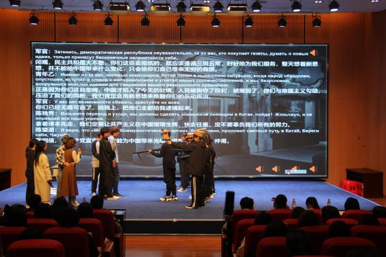 俄语22-3班演绎剧目《觉醒》,再现了中国代表在巴黎和会上的据理力争,反抗力量的夹缝求生,革命志士的舍身赴死,革命火种的星星燎原等场景,体现了中华民族不屈不挠,勇敢抗争的斗争精神。