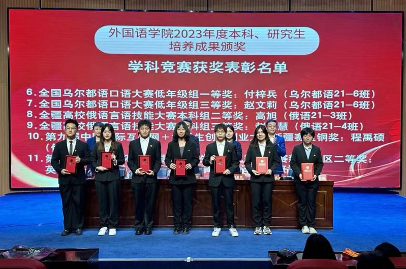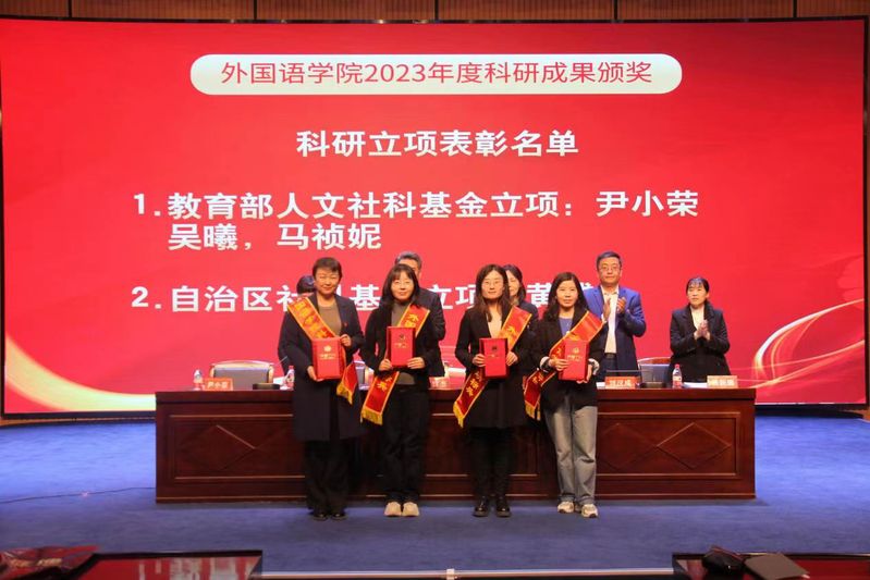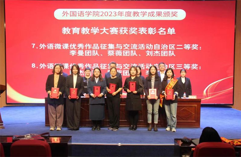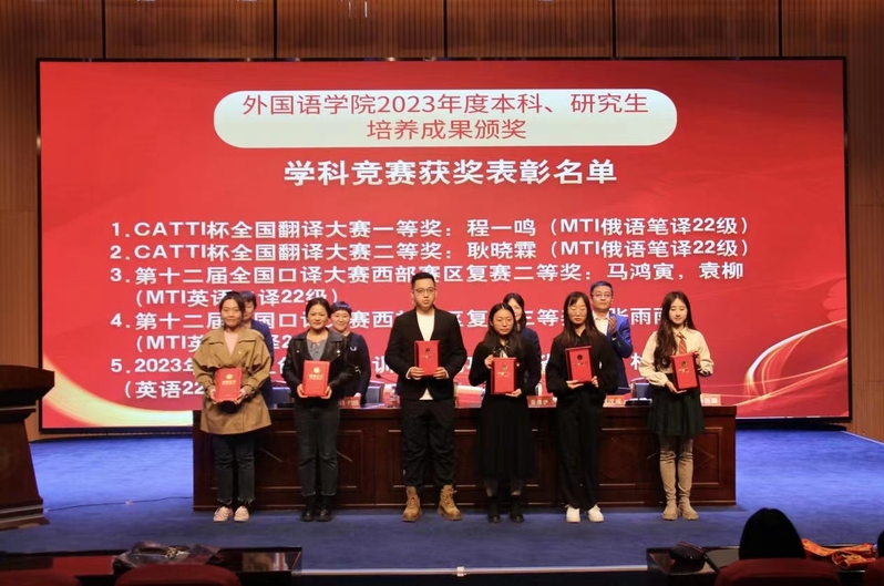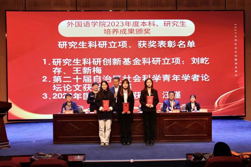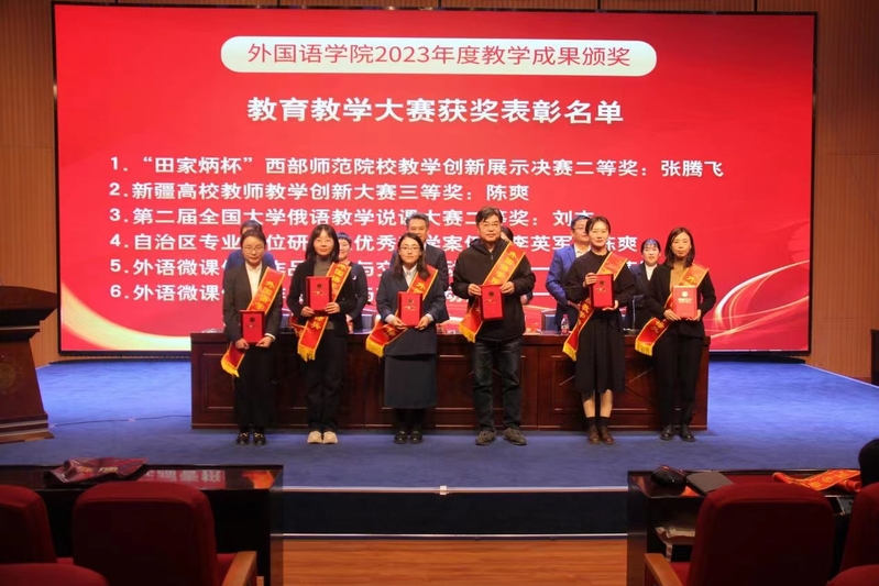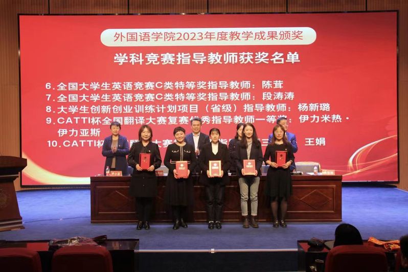 汇报结束之后,学院对2023年省部级及以上教科研立项,省部级及以上教学比赛获奖、学科竞赛优秀指导教师奖的25名教师,以及省部级及以上学科竞赛获奖、研究生科研创新基金项目立项、创新创业项目立项的16名学生进行了表彰。学院青年教师英语专业吴曦、日语专业张腾飞,及翻译硕士专业2022级俄语笔译研究生程一鸣作为获奖师生代表发言:感谢学院给予的宽阔平台,感谢学院党委的培养与肯定,感谢同事、同学给予的无私指导与帮助。并表示在未来的工作、学习中将踔厉奋进,不负韶华,用实际行动践行新时代青年教师、学子的担当与使命。