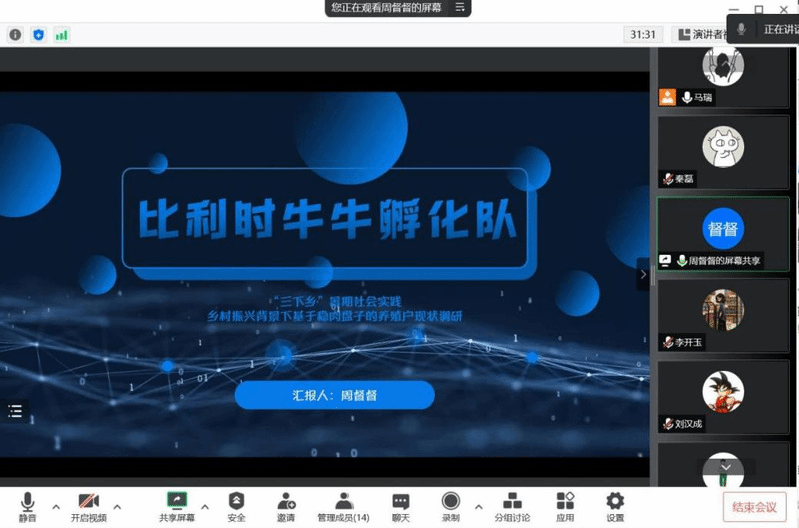 随后,学院6个获批立项项目团队负责人结合演示文稿,详细介绍了各项目在指导教师的指导带领下,立足项目优势及家乡特色开展与推进情况,同时也总结了项目开展过程中存在的问题及改进方向。