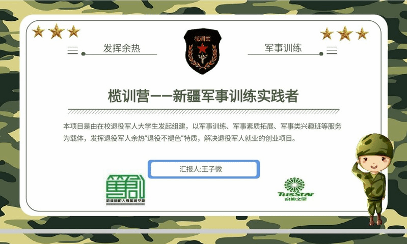 “榄训营—暑期军事训练实践”实践项目由翻译20-6班王子微申报负责,刘汉成师指导。该项目基于自治区双料银奖获奖项目及新疆冁微文化传媒公司开展创业实践,主要针对中小学生及有素质拓展意愿的企事业单位开展军训、夏令营、素质拓展等活动。团队于6月中旬完成与新疆兵拓的业务合作,6月23日第一期9班149人幼儿军事训练夏令营开营,盈收15万。第二期素质拓展与夏令营因防疫要求推迟举办。