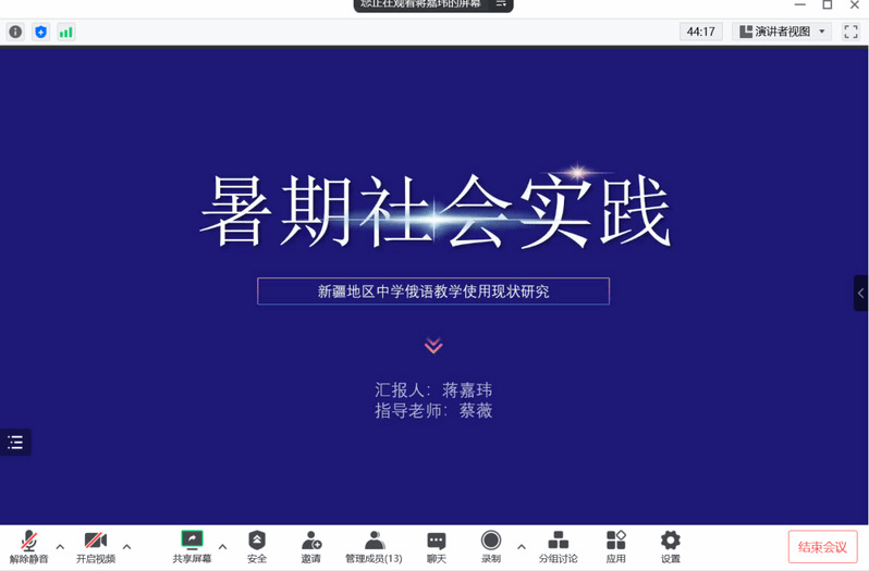 “新疆地区中学俄语教学使用现状研究”调研项目由俄语20-4班蒋嘉伟申报负责,蔡薇老师指导。该项目基于新疆各地中学俄语课程开设现状及学习者需求,中学及中学生为样本对中学俄语教学情况进行调研。暑假开始后,项目负责人带领团队前往新疆部分地区,对中学学生和教师进行问卷调查及访谈,实地调研中学16所,发放回收调研问卷近200份。目前,已经进入到数据资料整合、分析阶段。