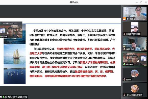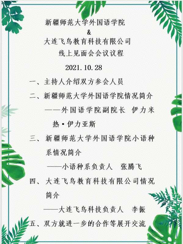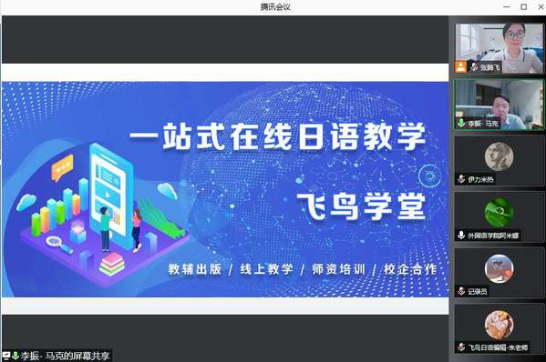 为加强院企合作,进一步推进产教融合,10月28日晚,太阳成集团tyc33455ccwww与大连飞鸟教育科技有限公司举行了线上见面交流会。学院院长阿米娜·阿布力孜、副院长伊力米热·伊力亚斯、小语种系负责人张腾飞、大连飞鸟教育科技有限公司负责人李振以及大连理工大学出版社编辑于洋、图书编辑朱薏宇、吴思瑶等参加了本次交流会。本次交流会是为了更好地推动双方进一步的合作和交流,探讨在小语种日语方面更深层次的合作空间。会议由小语种系负责人张腾飞主持。