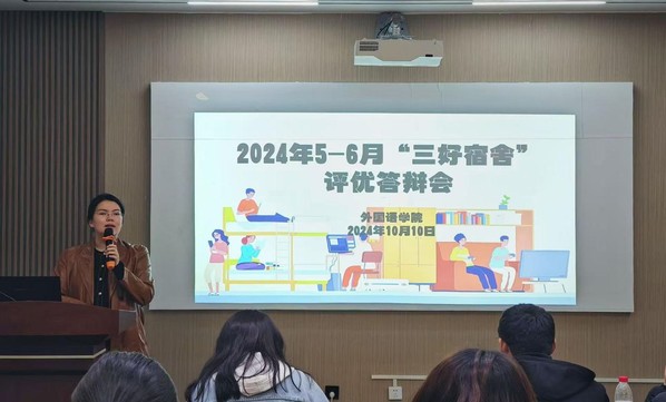 依据前期宿舍环境及卫生检查通报及各宿舍成员学业进步情况综合评选,学院从 116间参选宿舍中遴选 8 间入围本次评优答辩。本次答辩以 5 分钟陈述汇报的模式进行,答辩宿舍长聚焦“三好宿舍”评选标准,围绕文化内涵、宿舍布置、人员介绍、学习收获、宿舍氛围以及展望期许等方面进行了建设成果,借助音视频、PPT 以及现场汇报等形式展现宿舍建设特色。汇报过程中,宿舍代表答辩汇报精神饱满,思路清晰,富有特色,展现出了外院学子良好的内务水准以及积极向上的精神面貌。