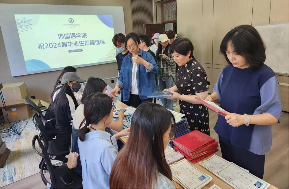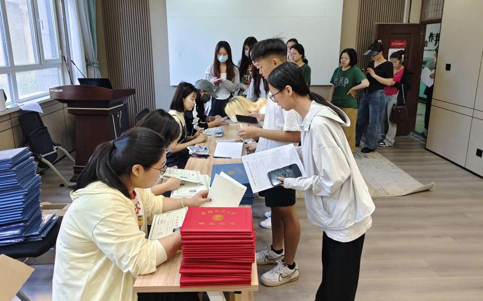 为方便毕业生集中办理学位证、毕业证发放手续,学院于6月7日在文澜楼107演讲厅设置“一站式”服务点,学生工作办公室全体辅导员、勤工助学助理分工协作,为毕业生集中办理审核、查验、扫码、发放等手续,保证毕业生尽快及时拿到“双证”。学院领导班子全体成员到场,向毕业生发放“双证”。