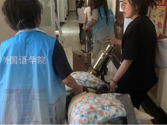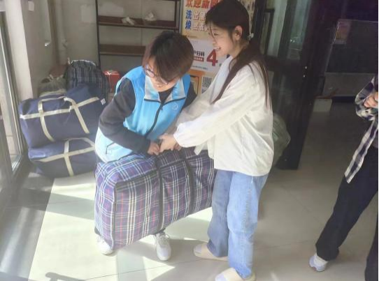 志愿者们为毕业生打包、搬运行李