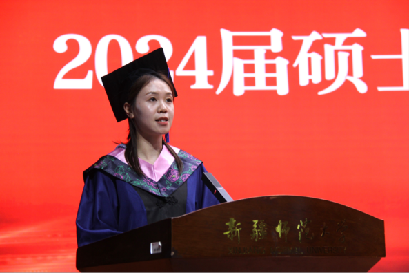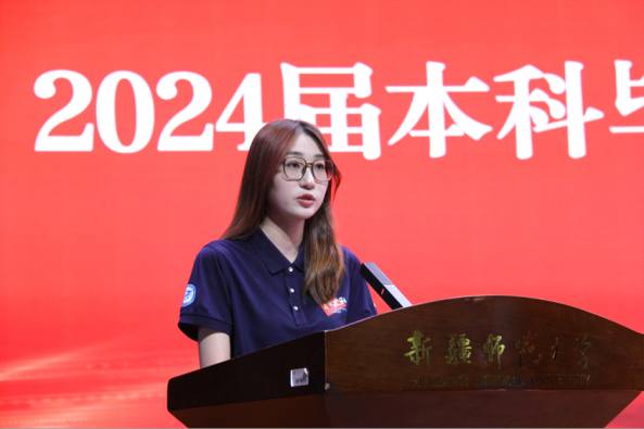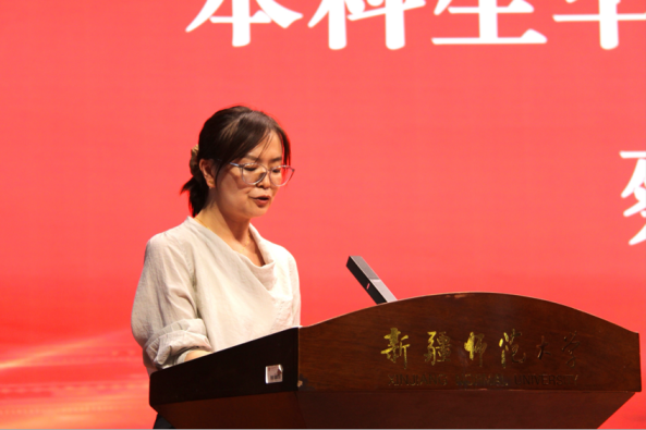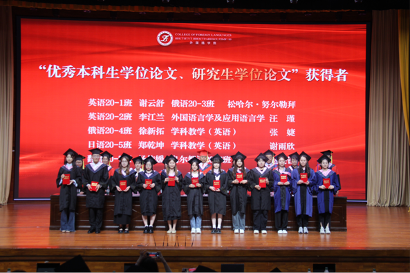 毕业典礼及学位授予仪式上,学院进行了“最后一次点名”、表彰了优秀毕业生、优秀毕业论文荣誉获得者,为毕业生拨穗正冠,授予学位并送上祝福和精心准备的毕业礼物。硕士毕业生导师、学院学位委员会委员、英语系主任刘韶华、俄语系副主任、俄语20-4班班主任蔡薇发言,希望毕业生坚定外语专业使命,继续学习拼搏,实现心中梦想。硕士毕业生代表、外国语言学及应用语言学汪瑾、本科生代表、翻译专业20-7班杨英丽代表发言:真情回顾在校学习、成长的点滴,感念师恩,表达了对校园生活的不舍和对未来的憧憬。最后,王世杰副校长寄语致辞,对毕业生在校取得的成绩和收获表示肯定,对即将开始的职业生涯与升学提出期许,勉励毕业生牢记专业使命,秉持“博学笃行、学融中外”的院训,践行“用外语讲好中国故事”的责任,锻炼实践外语本领,不负韶华、勇毅前行,为新时代外语教育事业及翻译事业做出贡献。