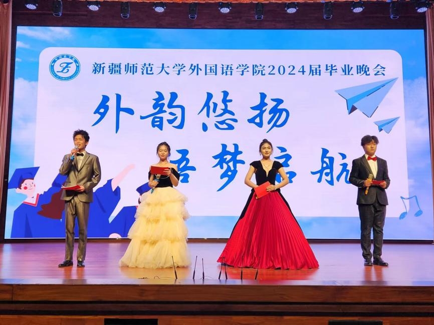 随后,学院“外韵悠扬,语梦启航”2024届毕业晚会正式开始,晚会由英语23-1班刘松烨、汪宇昕、俄语23-3班胡煜婷、乌尔都语23-7班麦迪娜·阿里木江主持。2024届英语专业毕业生范志斌领衔一众舞者以一曲拉丁舞《Fire Dance》点燃全场。随后,乌鲁木齐市秦剧团王婷携市戏曲协会4名会员与学院学生会6名学生同台表演“戏曲荟萃”越剧《天上掉下个林妹妹》、京剧《卖水》、黄梅戏《树上的鸟儿成双对》、秦腔《大登殿》选段;韩家宝、宋佳妮、张梓仪带来《玫瑰》《想你时风起》《可惜没如果》《童年歌曲》歌曲联唱;郑凯薇、张誉家、李琛琛等6位同学表演了舞蹈《Diamond》;王羽佳、张必圆表演琵琶、钢琴合奏《诀别书》;翻译22-6班演绎心理剧《重回妈妈的大学时代》;随后伊力米热·伊力亚斯院长和童琦老师与毛笑颖、康玉儿、买地牙·买买提、罗勇等同学一起用英语、日语、俄语、乌尔都语、韩语演唱了“歌曲联唱”;学院“书香外院”“武悦外院”兴趣课学员联合博新武术社表演书画、武术节目《书武融通》;陈凯悦、张海宁、吕林轩“舞蹈串烧”《Bite Me》《Smoothie》《Secret Story Of The Swan》《Go Hard》《Batter Up》;学院白马合唱团倾情演绎《如愿》《天空下雨,伞下有你》,最后,晚会在文佰马老师演绎的《再见》中落下帷幕。