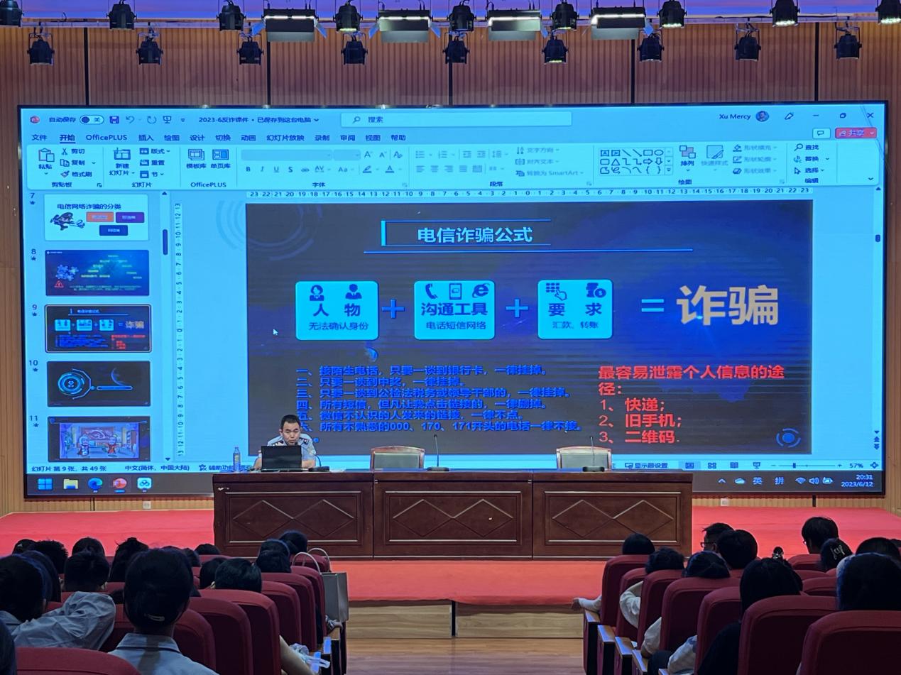 宣讲会伊始,王瑾老师播放了《防诈骗情景剧》、《校园采访之防诈骗篇》等视频素材,提醒同学们提升法治意识、熟悉诈骗套路,防范电信网络诈骗。