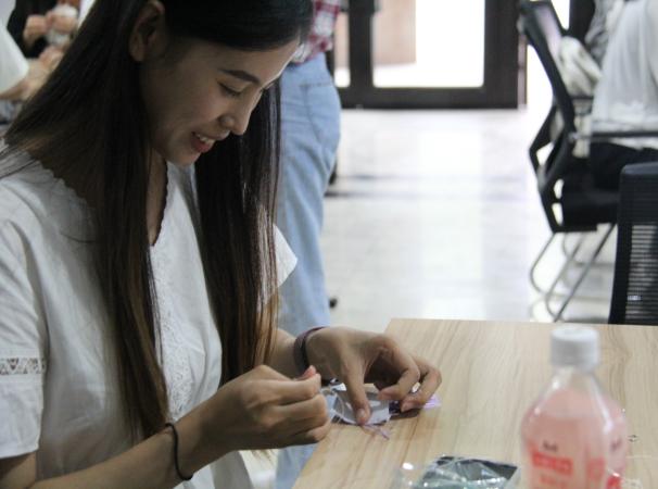 随后,志愿者将学院“三进两联一交友”老师、手作小老师、学生自由结合分成7个小组,分别将香包DIY制作材料——布料、艾草、薰衣草、挂绳、流苏、针线包等分发到各个小组。手作小老师结合教学视频向小组师生介绍了端午节的由来、习俗,讲述了香囊的制作步骤。大家纷纷穿针引线,一针一线地认真缝制起来,通过缝合、填香、挂苏、合口等步骤,大家一边讨论一边动手,不一会儿,一个个立体饱满又精致的香囊就在大家的手中呈现出来了。