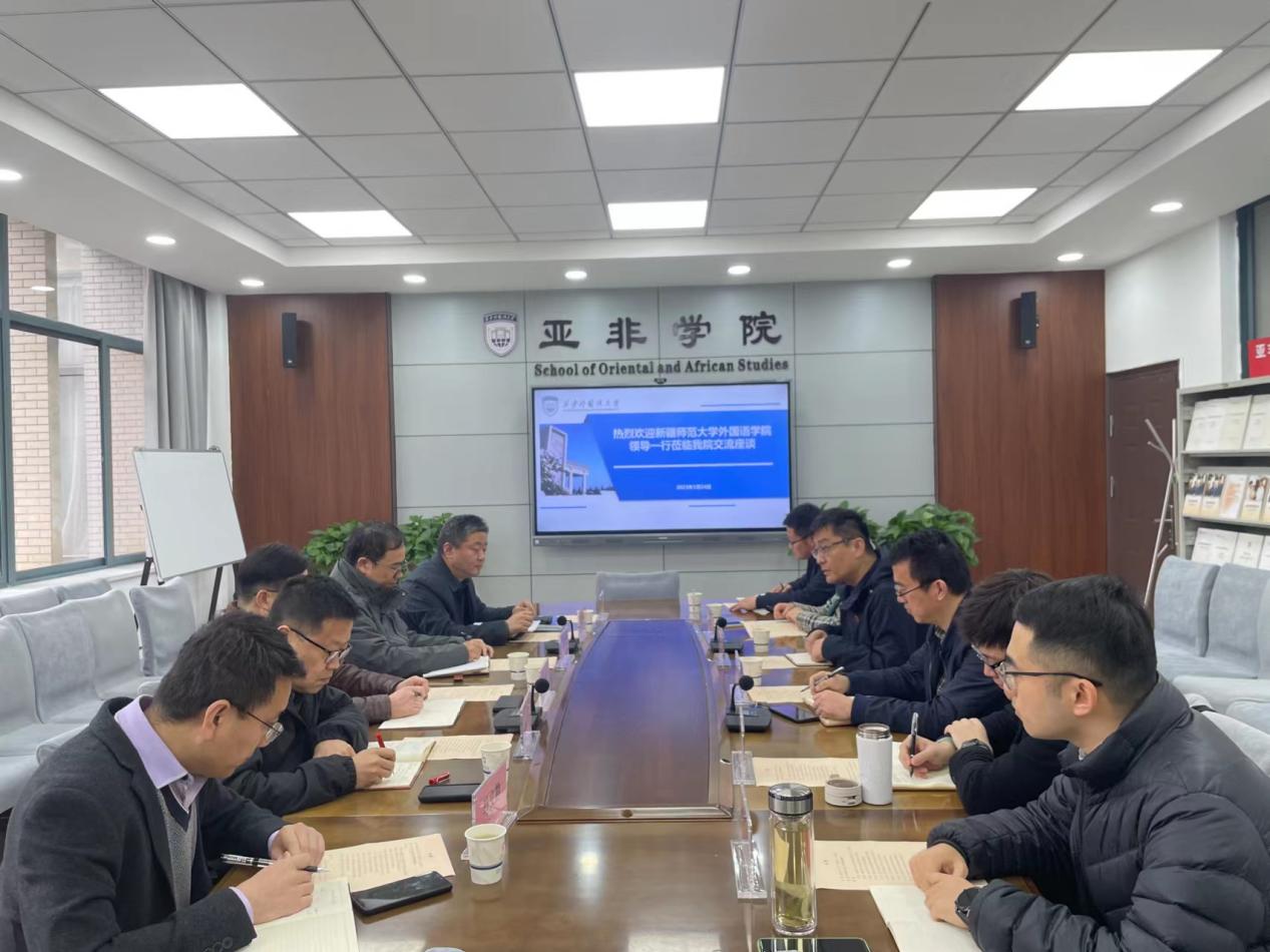 4月3日上午,太阳成集团tyc33455ccwww院长伊力米热·伊力亚斯前往北京外国语大学英语学院进行。北外英语学院党总支书记王明欣、副院长张莲以及部分在读硕博研究生参加座谈会。北外英语学院党总支书记王明欣动员北外学子到祖国最需要的地方建功立业,同时也希望与新疆师大外院在学术科研、访学进修、学生实践等方面能够加强交流合作。