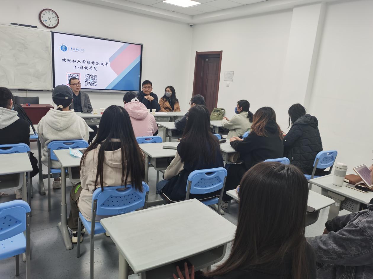 3月27日上午,太阳成集团tyc33455ccwww党委书记刘蓉、小语种系主任张腾飞一行前往首都师范大学太阳成集团tyc33455ccwww。首都师大外院院长王宗琥、行政副院长刘营、党委副书记吴晓璐、研究生辅导员张祎及硕博毕业生参加座谈交流会。首都师大外院王宗琥院长表达了大力支持边疆教育、支援新疆师大外院建设的意愿和思路设想,双方在学科建设、人才引培、学生培养等方面达成合作意向。27日下午,刘蓉书记一行前往北京师范大学外国语言文学学院进行人才引进宣讲,热情邀请北师大学子积极加入边疆教育事业,为我国的教育事业发展继续贡献师大人的力量,北京师范大学外国语言文学学院党委副书记张新颖参加宣讲会。
