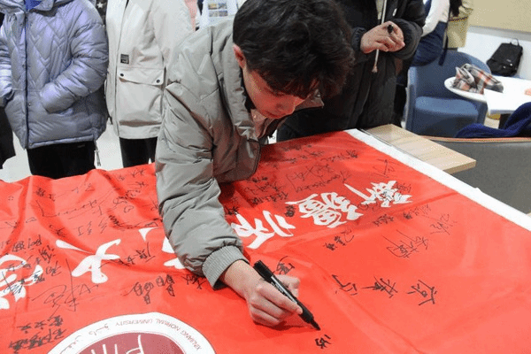 在两位党员志愿者详细而生动的讲解下,2022级新生的初次学院之旅也告一段落,最后,大家纷纷在院旗上签名留念,表达对学院最真挚的热爱。