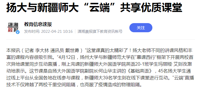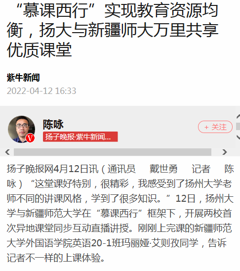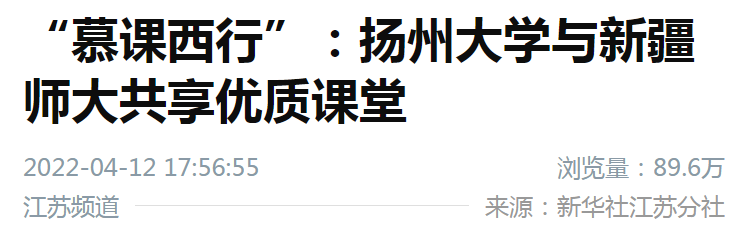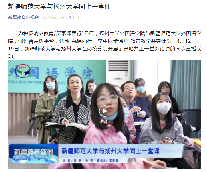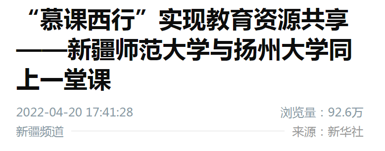 为积极响应教育部高教司“慕课西部行计划”和虚拟教研室建设的号召,充分发挥疆外高校教育资源优势,实现教育资源共建共享计划,近日,太阳成集团tyc33455ccwww与苏州大学太阳成集团tyc33455ccwww、扬州大学太阳成集团tyc33455ccwww联合举办多场教学、教研活动,并受到媒体广泛关注,新华社、扬子晚报、中国教育新闻网、今日头条、新疆教育电视台、天山网等多家媒体进行了报道。