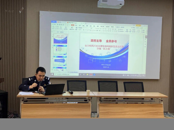 首先,梁宝庆警官从网络电信诈骗的常见类型与骗术操作、电信诈骗构成要素、实施路径及防范措施三个方面,结合高校发生的真实案例进行了讲解。随后,梁宝庆从当前网络意识形态形势、网络意识形态工作原则和责任、加强管理的方法和途径以及个人防范的重点等方面,讲述了网络意识形态工作的重要意义和工作方法。