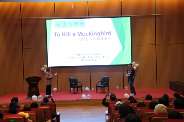 教师第一党支部马晓玲老师与俄语20-4班宋安琪讲述《杀死一只知更鸟》中种族歧视与偏见的社会问题,倡导学生形成公正、宽容、博爱的品质,坚持真、善、美。