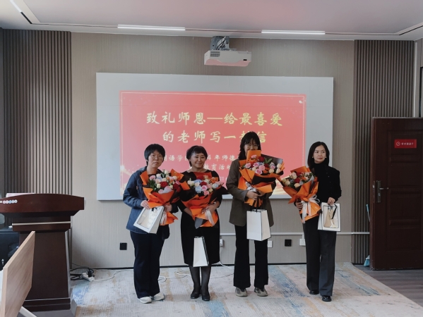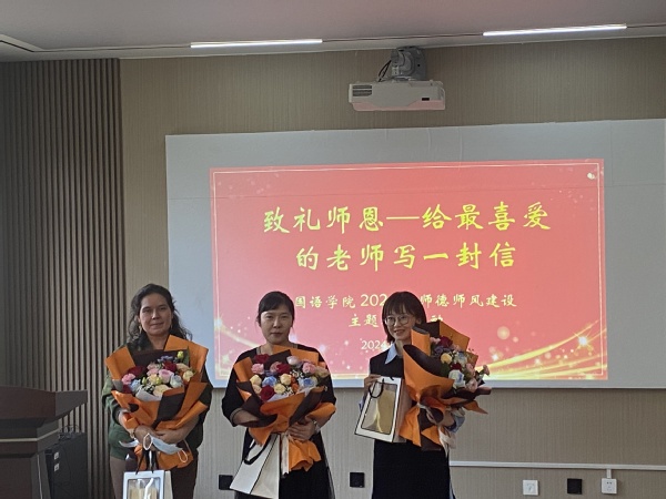 接着,学院向“致礼师恩,向最喜爱的老师致信”主题系列活动中收到感恩信最多的7位老师敬献鲜花。此次活动中,学院共收集到研究生、本科生各年级学生手写感恩信551封,有效信件497封,通过前期梳理、分装、排序,最终7位老师受到表彰。紧接着,学院党委向银龄学者、外籍教师及顶岗实习教师敬献鲜花和月饼。