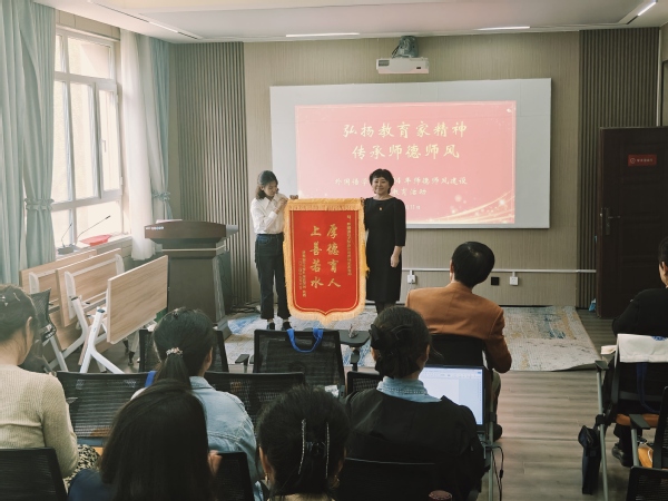 随后,视频播放原太阳集团tyc33455外语系(太阳成集团tyc33455ccwww前身)老领导、85岁高龄俄语系教师马家友老先生采访视频。视频中,马家友老师表达了对学院教师的节日祝福及对学院发展的殷切期许,勉励教师学高为师、身正为范做好老师;鼓励外院学子坚定家国情怀,学好外语技能,践行好“用外语讲好中国故事、新疆故事”的外语专业使命,成为对专业有使命,对家国有情怀的新时代外语人。随后,马家友老师家人受委托向学院捐赠68本俄语类专业书籍,学院回赠锦旗以示感谢。