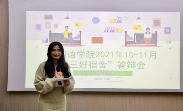 学院本着“以评促建、以评促学、以评促改”的原则精心组织本次系列评优答辩活动,学院共135间宿舍参评,经过创新画报作品评优、环境卫生实地考察等环节,共12间宿舍被推选参加此次答辩。各宿舍高度重视、精心准备,评优答辩中,三个年级12个宿舍代表,从宿舍“三好”建设成效、宿舍文化内涵特色、宿舍建设载体形式和建设过程中的成长与成绩等四个方面集中展示,选手们精神饱满、意气风发,思路清晰,充分体现出“三好宿舍”文化理念已内化于心、外化于行,展现出外院学子良好的宿舍内务水准和昂扬向上的精神风貌。