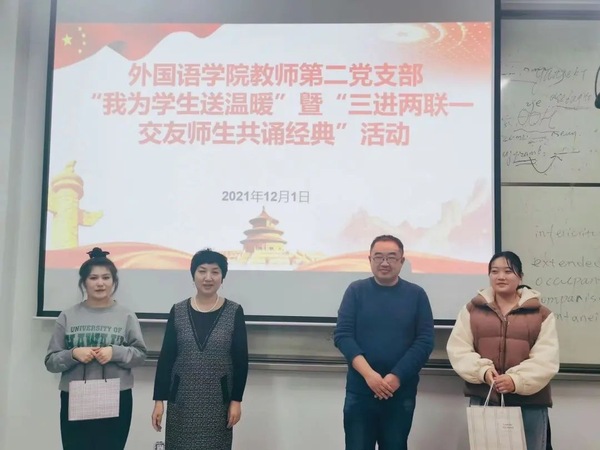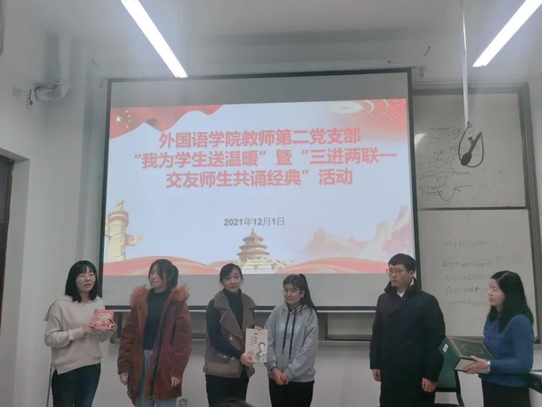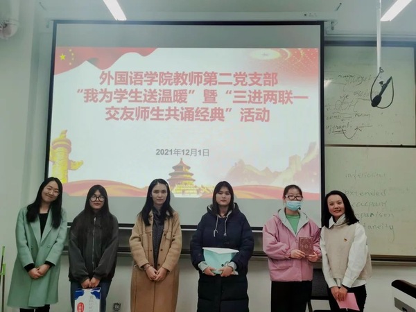 为深入学习贯彻党的民族工作会议精神与民族政策,深化“民族团结一家亲”活动,促进各民族师生交往交流交融,太阳成集团tyc33455ccwww教师第二党支部全体教师及三进两联一交友学生代表于2021年12月1日下午17:00在文科五号楼114教室开展“我为学生送温暖”暨“三进两联一交友共诵经典”活动。