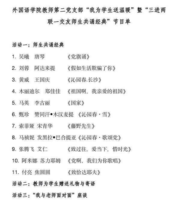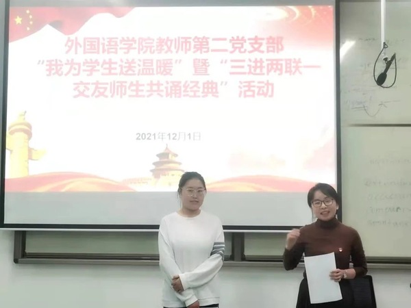 此次活动以中外文学经典为诵读内容,旨在引导党员师生对中外文化的理解和对优秀文化的认同,增强家国情怀、坚定文化自信。活动现场,党员教师与“三进两联一交友”结对学生,声情并茂地用中文、英文、俄文、日文诵读《党旗颂》、《假如生活欺骗了你》、《致过往,爱当下,惜时光》、《沁园春·雪》、《致恰达耶夫》、《藤野先生》等经典诗词散文,深情表达对生活、对家国的赞美和热爱。