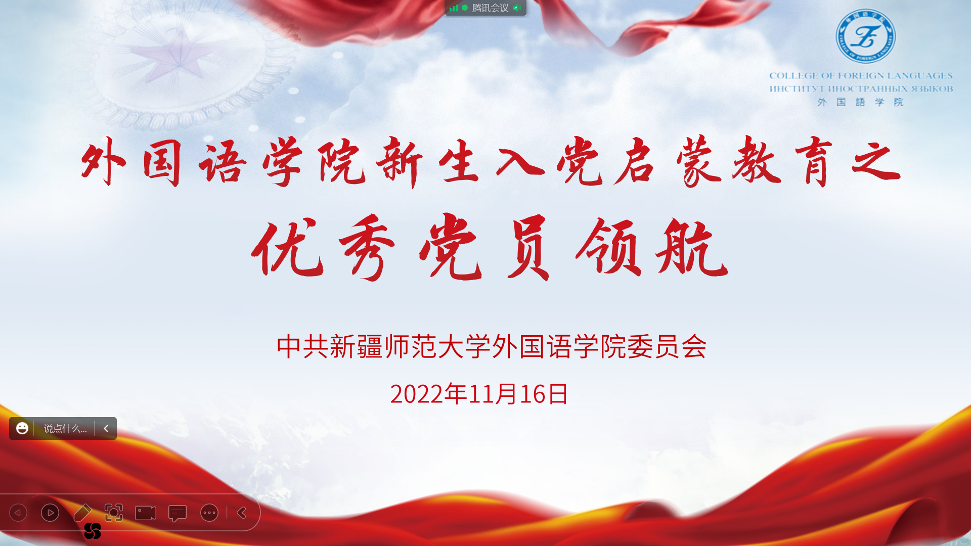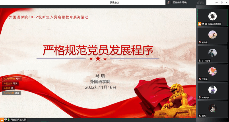 为进一步学习贯彻党的二十大精神,引领青年学子主动担当时代责任,切实发挥优秀党员学子在学生群体中的朋辈示范作用,教育引导2022级新生坚定理想信念、积极向党组织靠拢,学院11月16日下午通过腾讯会议方式举办“2022级新生入党启蒙教育之优秀党员领航”活动,学院党委副书记、纪委书记刘汉成以及学工办全体辅导员、2022级新生参加了此次活动。活动由本科生第一党支部书记马瑞主持。