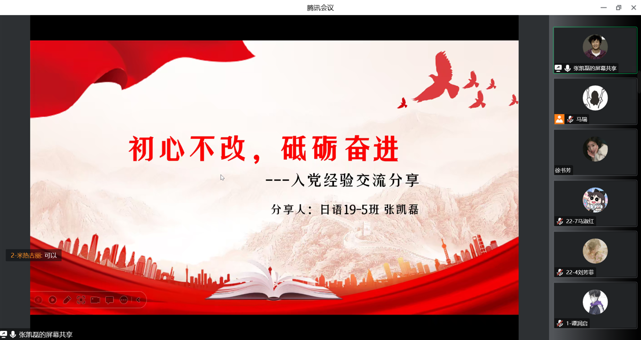 本科生第二党支部党员、日语19-5班张凯磊同学以“初心不改 砥砺奋进”为题从入党前期的思想准备,入党过程中的努力以及入党后的感想体会等三个方面向大家分享了自己入党的心路历程。鼓励学弟学妹坚守初心、苦练本领,早日加入党组织。
