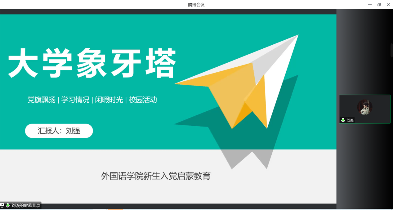 本科生第二党支部党员、俄语19-4班刘强同学以“大学象牙塔”为题,从入党经历、学习方法、校园活动、创新创业、社会实践等方面讲述自己大学成长历程,鼓励学弟学妹时刻以党员标准严格要求自己,端正入党动机,积极参加校园文化活动,提升自己,早日加入党组织。
