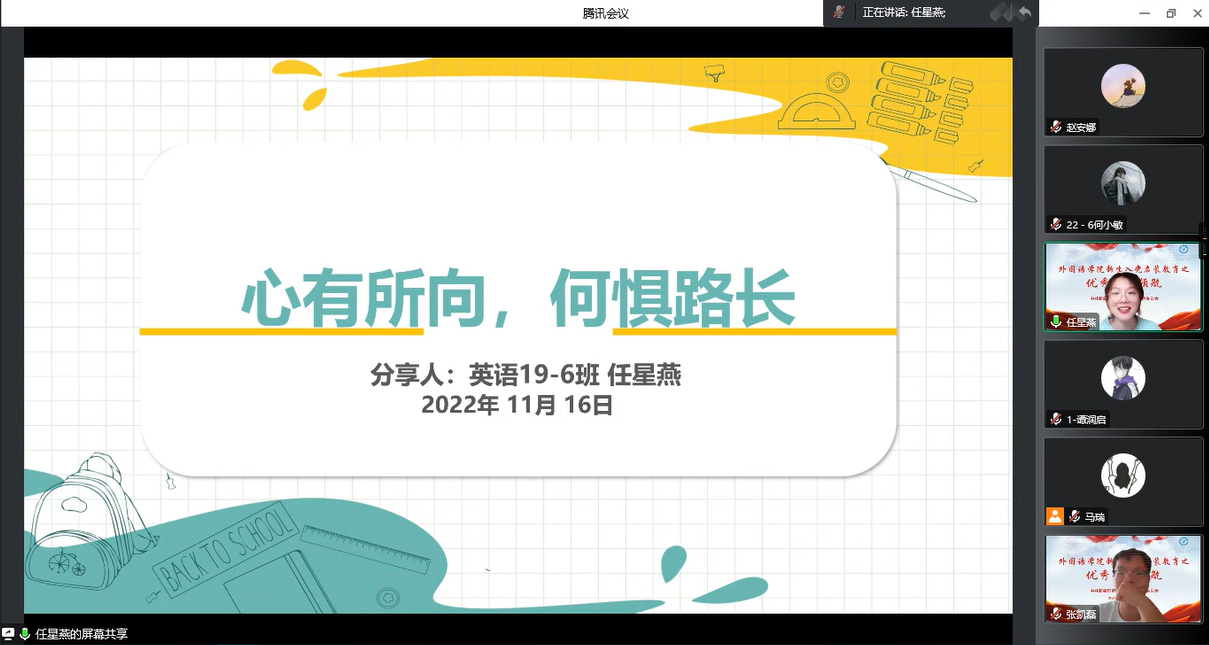 本科生第一党支部党员、英语19-6班任星燕同学以“心有所向,何惧路长”为题,结合自己的学生干部经历围绕如何平衡学习与工作、如何发挥学生党员先锋作用进行分享,鼓励新生积极参加社会实践、志愿服务等活动,努力提高自身综合能力,以实际行动积极向党组织靠拢。