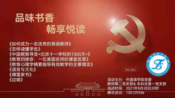 8月28日,教师第二党支部联合本科生第一党支部继续进行线上读书分享交流。师生党员分享了《如何成为一名优秀的英语教师》、《怎样读懂学生》、《中国教育寻变< 北京十一学校的1500天>》、《教育的使命:一位美国名师的课堂反思》、《教育心理学精要:指导有效教学的主要理念》、《语言与文化》、《傅雷家书》、《边城》共计八本教育经典丛书和红色文学经典书籍的读书感悟。教师第二党支部书记吴曦对本次读书分享进行了总结,她勉励大家,“立身以立学为先,立学以读书为本”,作为美好教育的传播者,美好故事的讲述人,在教育的道路上要与书相伴,汲取前行智慧、凝聚奋进力量。