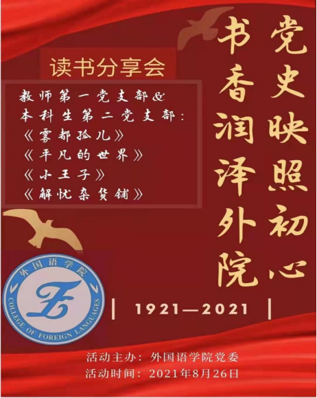 为深入推进党史学习教育扎实有效开展,加强学院师生党支部共建及党团党群共建,合力共促学生成长,营造浓郁的读书氛围,结合本科生“百本书阅读工程”,太阳成集团tyc33455ccwww党委分别于8月27日和8月28日组织学院教师第一党支部、教师第二党支部、本科生第一党支部和本科生第二党支部师生党员、发展对象、积极分子和部分学生代表开展了主题为“书香润泽外院,党史映照初心”的品味书香、畅享悦读线上读书交流分享会。