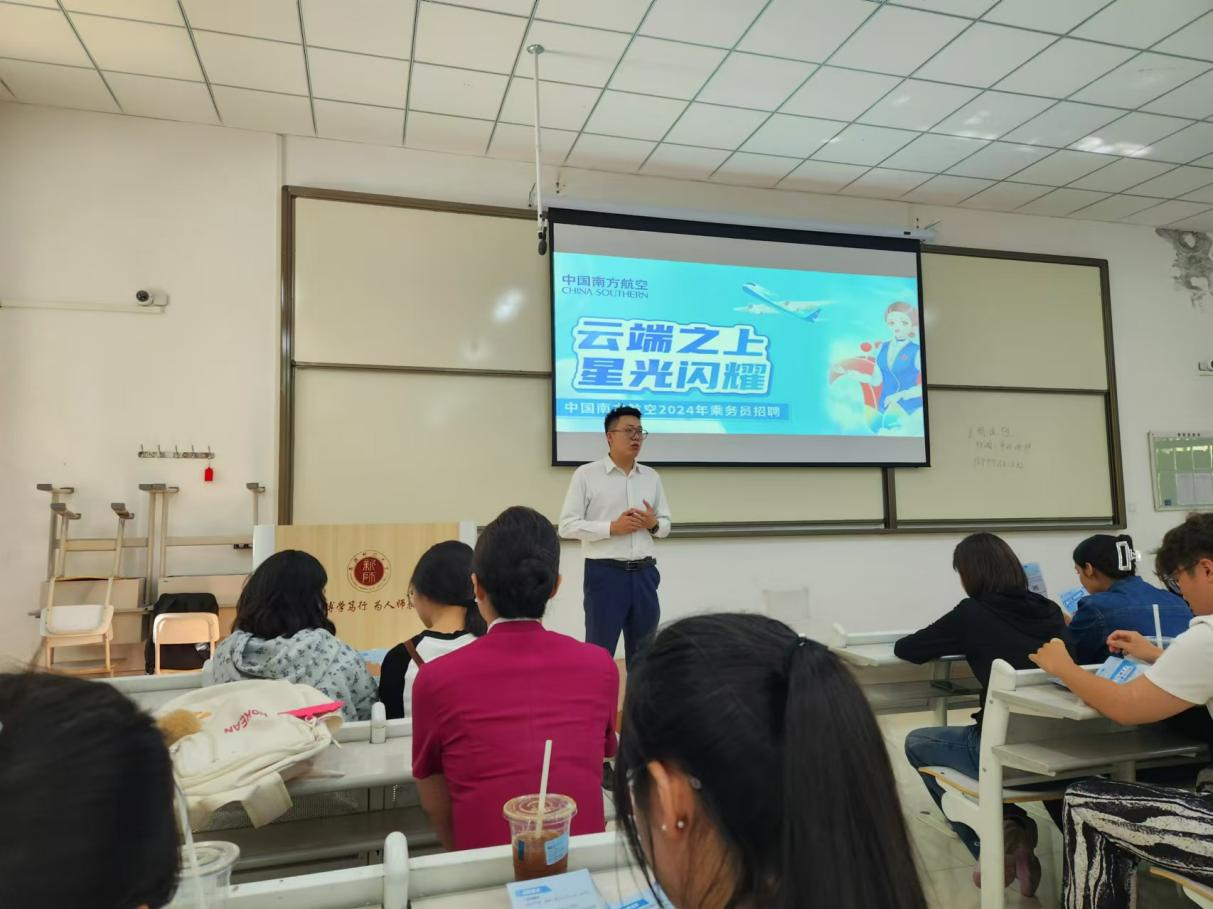 为进一步学习贯彻党的二十届三中全会精神,落实习近平总书记关于网络强国的重要思想论述,搭建毕业生与用人单位双向选择平台,强化访企拓岗,为我校毕业生高质量就业拓宽渠道,促进毕业生就业。太阳成集团tyc33455ccwww联合学校就业指导中心于9月4日在治学楼B区117教室举办2025届毕业生专场宣讲会。邀请中国南方航空公司新疆分公司、新疆斯拓汽车零部件制造有限公司宣讲。学校就业指导中心副主任王达、学院党委副书记、纪委书记刘汉成,学生工作办公室辅导员王平平、历史与社会学学院辅导员巴特门克及来自太阳成集团tyc33455ccwww、地理科学与旅游学院、中国语言文学学院、商学院、数学科学学院的研究生、本科生170余人参加招聘会。