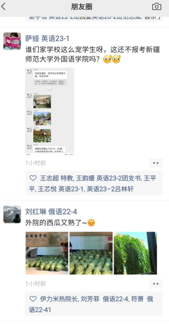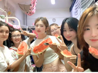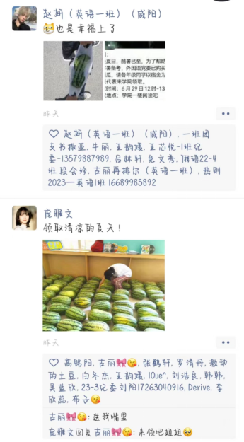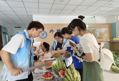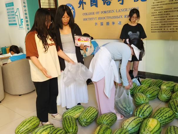 上午11点,西瓜装运车抵达学校,学院师生一同卸载西瓜、流水搬运、麻袋拆解、清点过秤。为了让外院学子第一时间品尝到西瓜,学院师生分工合作,登记、选瓜、切半、切牙,为学子们送上一份清凉与关怀。老师们和志愿者们为各宿舍依次发放西瓜,师生脸上都洋溢着欢乐的笑容,围坐在一起,品尝着清甜的西瓜,交换着夏日问候和备考祝福,欢声笑语此起彼伏,驱散了学生由于天气和考试所带来的燥热,为这炎热的夏日增添了一抹清凉。