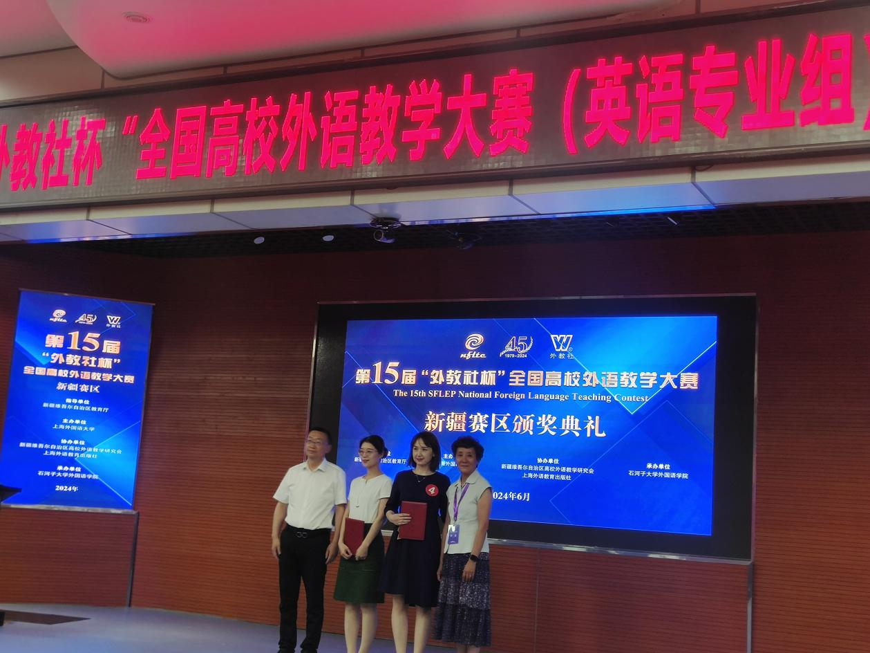 2024年6月29日,第十五届“外教社杯”全国高校外语教学大赛(英语专业组)新疆赛区比赛在石河子大学顺利落下帷幕。大赛由新疆维吾尔自治区教育厅指导、上海外国语大学主办、新疆维吾尔自治区高校外语教学研究会与上海外语教育出版社协办,本次现场比赛共有来自新疆10所高校的11名教师参加复赛。我院青年教师阿米拉·阿不都热西提经过现场授课和说课环节的层层选拔,取得了新疆赛区一等奖的优异成绩。