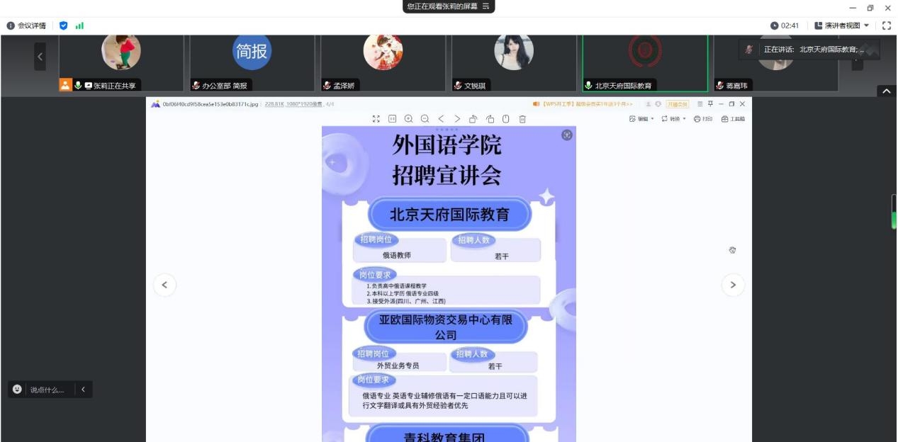 本次线上招聘会,是学院2024年召开的第二场线上招聘会,不仅为招聘单位及毕业生搭建了双选平台,也加强了学院与企业之间的联系与合作。今后,学院将继续举办就业活动,强化访企拓岗、引企进校,为毕业生提供更多优质就业岗位,为社会输送优秀外语人才,助力学院高质量发展。