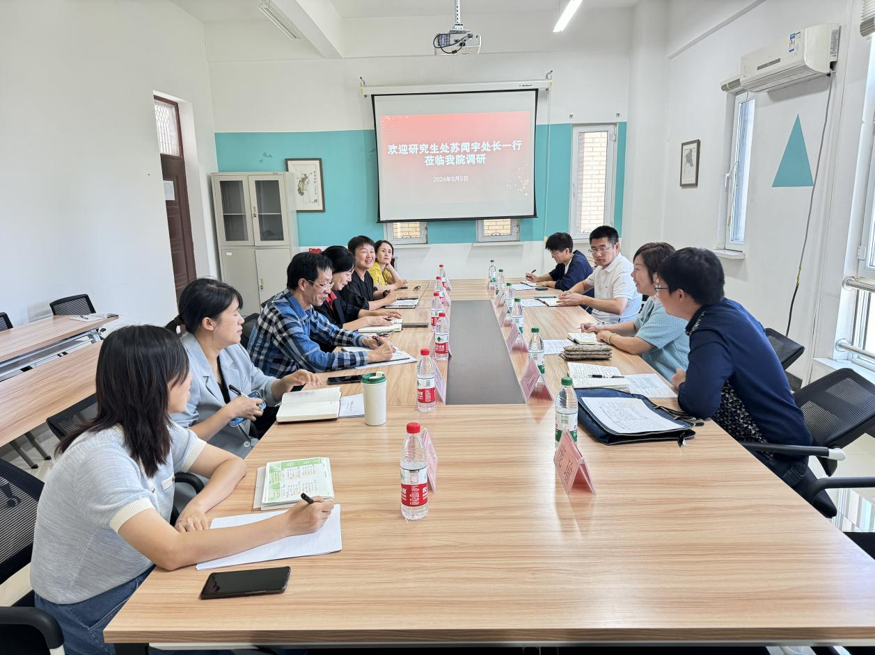 座谈会上,学院党委书记董馥伊对研究生处一行的到来表示诚挚的欢迎,副院长尹小荣介绍了学院在学科发展、队伍搭建、人才培养、科学研究以及社会服务等方面做出的工作和努力。阳志清教授针对此次调研内容详述了我院未来三到五年在学科发展、队伍建设、科学研究、人才培养等板块的规划,并希望研究生处能在我院未来的发展中持续赋能,给予更多的支持。