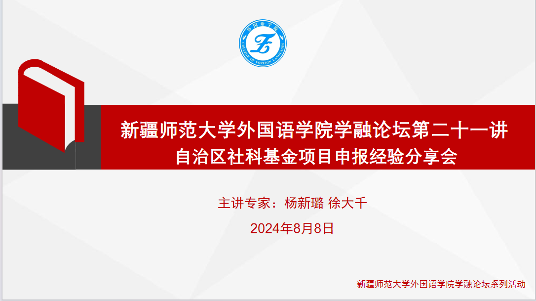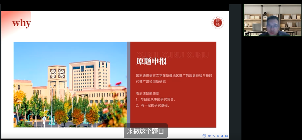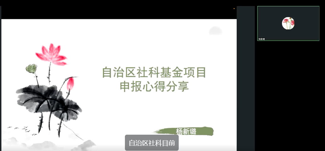 后,杨新璐副院长则从项目选题、综述凝练研究方法及论证、研究感悟四个方面分享了个人申报自治区社科基金项目的所思所感。她强调选题须结合个人研究专长、挖掘研究亮点,并基于前期研究经验,反复修改打磨课题论述。课题申报唯有持续坚持方能守得云开见月明。