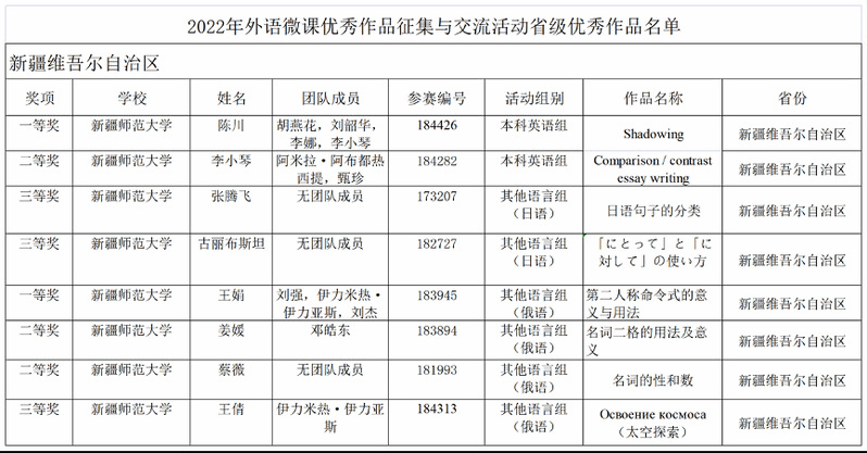 8月31日,全国高校外语微课大赛新疆赛区赛暨2022年高等学校外语微课优秀作品征集与交流活动经由主办方新疆高校外语教学研究会完成评审并进行省级优秀作品名单公示。新疆20所高校的105个优秀微课作品入围本次大赛,太阳成集团tyc33455ccwww推荐的11个作品全部进入终评。经过专家组的激烈评审,最终太阳成集团tyc33455ccwww教师团队作品获得自治区一等奖2项、二等奖3项、三等奖3项,其中一等奖作品晋级全国决赛。
