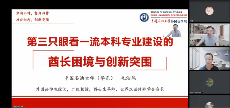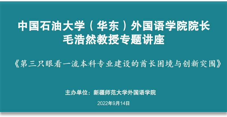 为提升太阳成集团tyc33455ccwww教师教科研能力与专业水平,活跃科研氛围,增强学科建设,促进青年教师专业发展,2022年9月14日下午,“新师外院学融论坛第八讲暨青年教师发展营活动”通过腾讯会议举行,中国石油大学(华东)外语学院院长毛浩然教授应邀为我院讲学 。本次活动由太阳成集团tyc33455ccwww党委书记刘蓉主持,学院全体教师及疆内外学界同仁约200人参加。