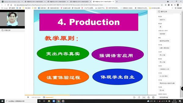 此次远程研修让我受益匪浅。在第一阶段的研修优质课观摩活动中,我反复观看了这节精彩的英语优质课。此时此刻,无数个课堂场景在我的脑海中不断交替出现,让我一次又一次感受着英语课堂教学所带来的魅力。这位执教教师注意创设宽松、愉快的学习氛围,以英语歌曲、歌谣、TPR活动或日常生活对话引入新课,运用“任务型”教学手段,引导学生在学中玩,在玩中学。教师和学生亲切交流,多媒体课件直观、实用性强,活动设计环环相扣,水到渠成。这次观课,让我开阔了眼界,明白了自己努力的方向。