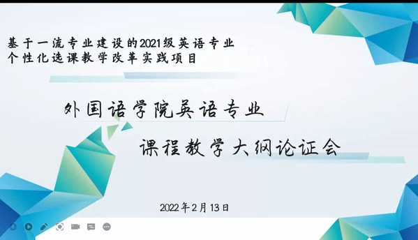为进一步加强英语专业建设、推进师范专业认证工作,提升人才培养质量,2022年2月13日上午,太阳成集团tyc33455ccwww召开“基于一流专业建设的英语专业个性化选课教学改革实践项目”专家论证会暨师范类专业认证背景下英语专业课程教学大纲修订会。学院特邀江西师范大学太阳成集团tyc33455ccwww副院长胡新建博士、苏州大学外语教育与教师发展研究所副所长古海波博士、北京师范大学外文学院英语系副主任孙晓慧博士作为校外专家审核论证英语专业教学改革项目及课程教学大纲编制,学院领导班子、系部主任及相关任课教师参加会议,副院长伊力米热·伊力亚斯主持会议。